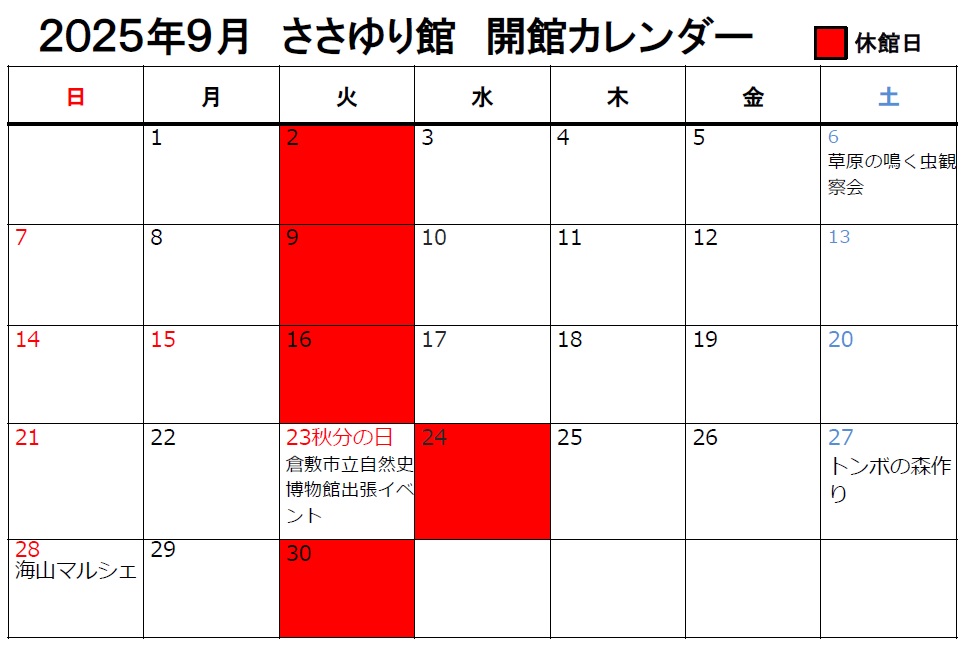 2025年 ささゆり館 開館カレンダー