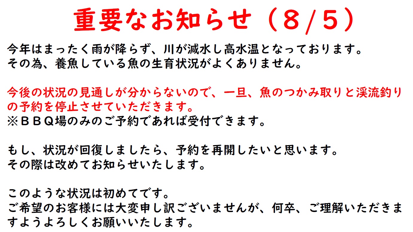 そのため、BBQ場や魚のつかみ取り・渓流釣り体験は終日予約不可となります。