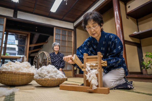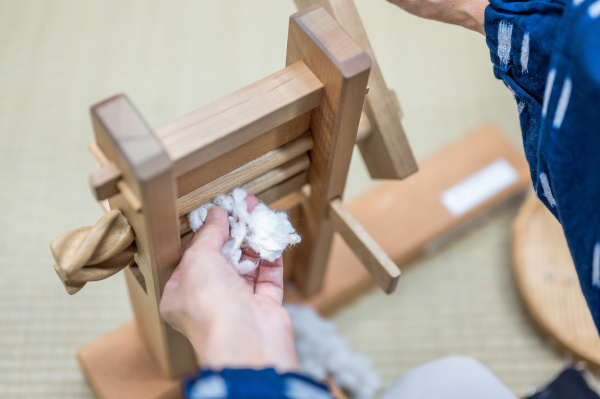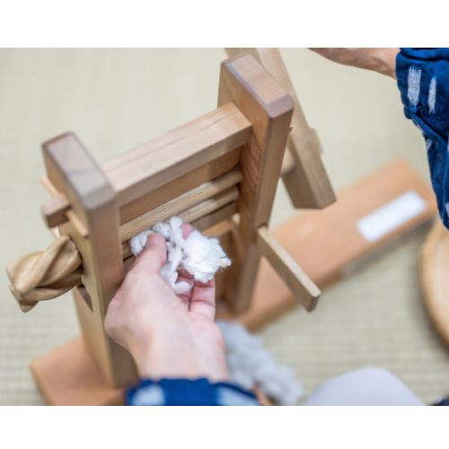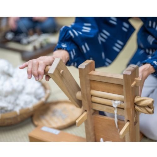 綿繰り体験 綿打ち体験 糸紡ぎ体験 機織り体験 卓上手織り機 くるみボタン作り体験 綿繰り体験 綿繰り機 綿と種を取り分ける道具 ローラーが 2つ付いていて、ハンドルを回しながら綿花を入れると、ローラー間の狭い隙間に繊維だけが入ってゆき、硬くて大きな種は、取り残されて手前に落ちる仕組みです。 小見出しを入力します 会員が作業をしている様子です。 引用です。■ ■ ・ | 1 | 2 | 3 | 4 | 5 | 6 | ■実綿差し ■ 乾燥させた実綿をローラーの間に投入しているところです。 ■綿繰 ■ ハンドルを回して実綿を通過させているところです。写真でもわかるように手前反対には棉の繊維だけが出てきています。 ■ ■ ■
